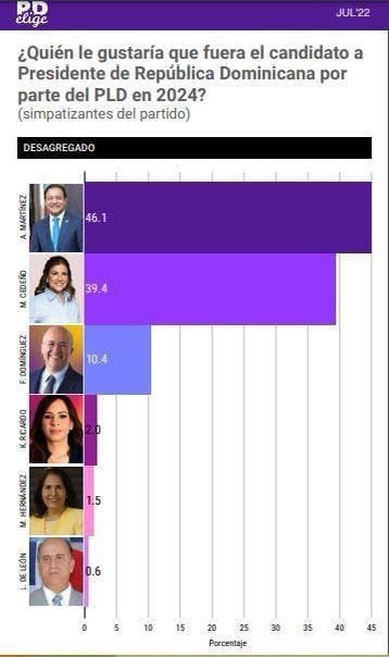 El levantamiento de opinión indicó que el 46.1 por ciento de los miembros del PLD favorecen que Martínez sea el próximo candidato presidencial, frente a un 39.4 que se identificó con la ex vicepresidenta Margarita Cedeño.