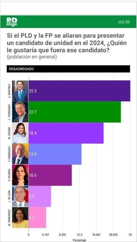 En un escenario donde el Partido de la Liberación Dominicana y la Fuerza del Pueblo decidan aliarse para llevar un candidato de Unidad, la población en general opinó que debe ser Abel Martínez, al otorgarle el 25.5% de preferencia, frente a un 22.7% para Leonel Fernández, 18.4% para Margarita, 13% Brito, 10% Ricardo, 5.5 %De León y 4.3% Maritza en términos porcentuales.