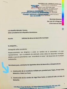 Nolio, en misiva enviada al poder ejecutivo solicitando el acueducto múltiple por gravedad, además el alcalde en la misma misiva solicitó varias obras más para el beneficio de los sectores ya mencionados.