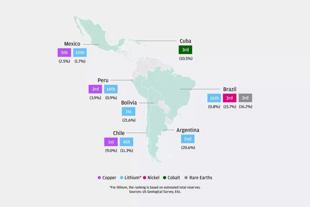 Brasil concentra una gran proporción de níquel y tierras raras, y Cuba ocupa el tercer lugar mundial en cobalto, evidenciando el peso estratégico de la región en la economía global de minerales críticos.