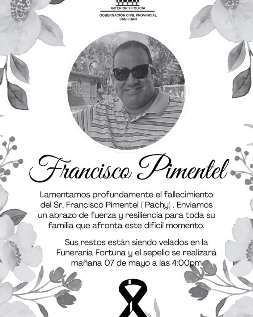 San Juan de la Maguana, RD- La gobernadora provincial de San Juan, la Dra. Ana María Castillo, lamentó la muerte a destiempo de Francisco Pimentel cariñosamente conocido por todos por Pachy Grúa.