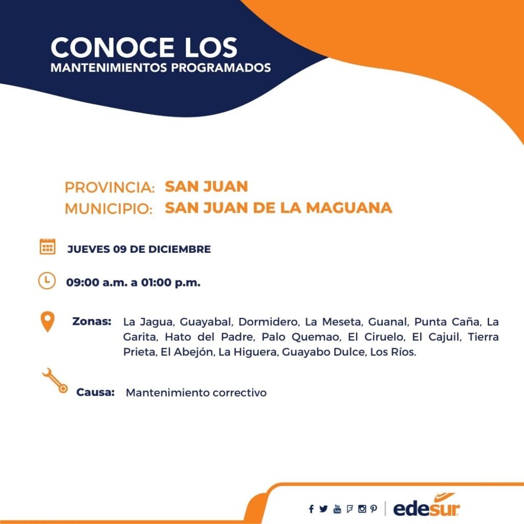 San Juan de la Maguana, RD- La empresa Edesur Dominicana informa que realizará trabajos preventivos para garantizar el mayor suministro de energía eléctrica, en la provincia de San Juan.