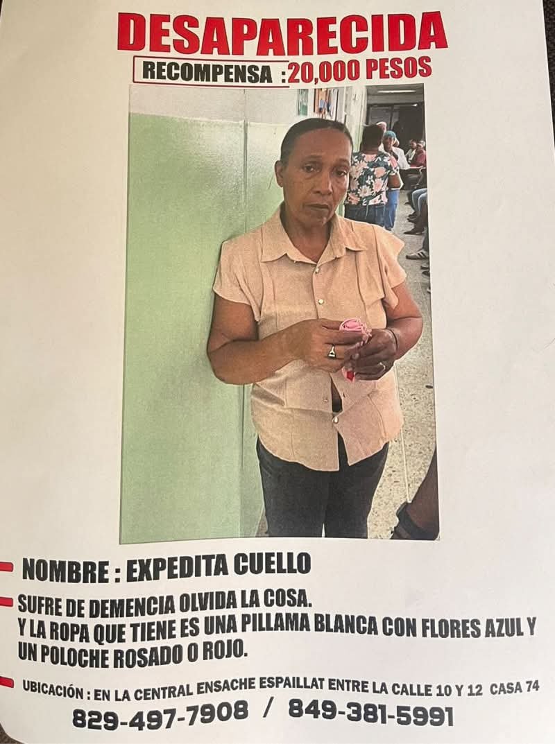 si usted conoce alguna información acerca de Expedita Cuello puede comunicarse al (829)-497-7908 y (849)-381-5991