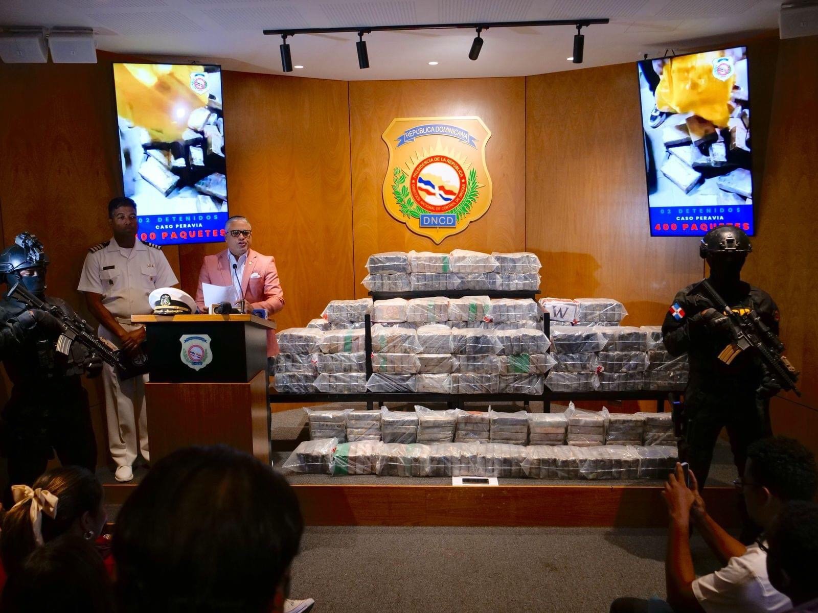 La Dirección Nacional de Control de Drogas (DNCD), efectivos de la Armada de República Dominicana, la Fuerza Aérea y agencias de Inteligencia del Estado, coordinados por miembros del Ministerio Público, confiscaron un cargamento de 400 paquetes presumiblemente cocaína, y se apresó a dos dominicanos, en una operación de interdicción conjunta, desarrollada frente a las costas de la provincia Peravia.