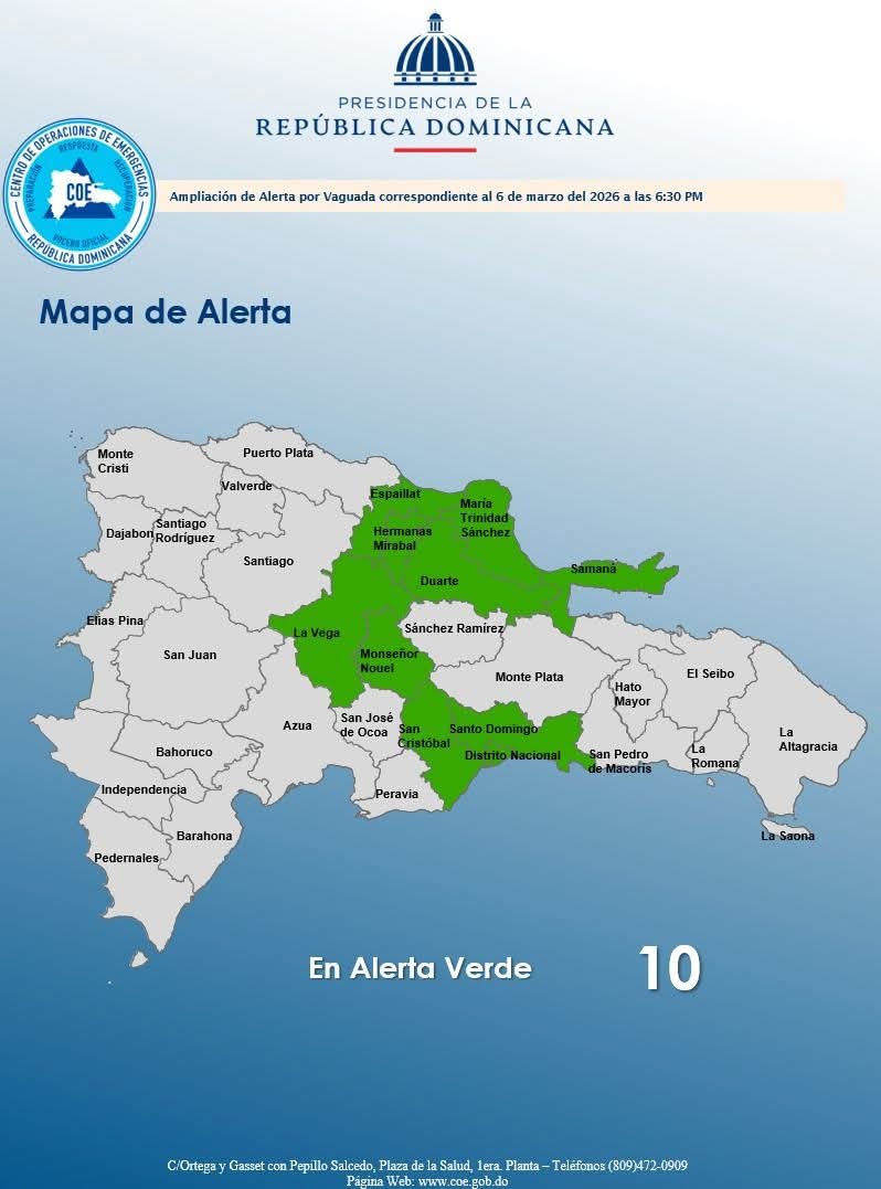 Las provincias bajo alerta son: Monseñor Nouel, Hermanas Mirabal, La Vega, San Cristóbal, Samaná, María Trinidad Sánchez, Duarte, Espaillat, Santo Domingo y el Distrito Nacional.