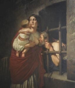 El pobre hombre fue condenado a "muerte de hambre" por robar una hogaza de pan durante el reinado de Luis XIV en Francia. La mujer era su única hija y la única visitante de su celda. Se le permitió visitarlo todos los días, pero fue registrada a fondo de tal manera que no se llevaba comida.