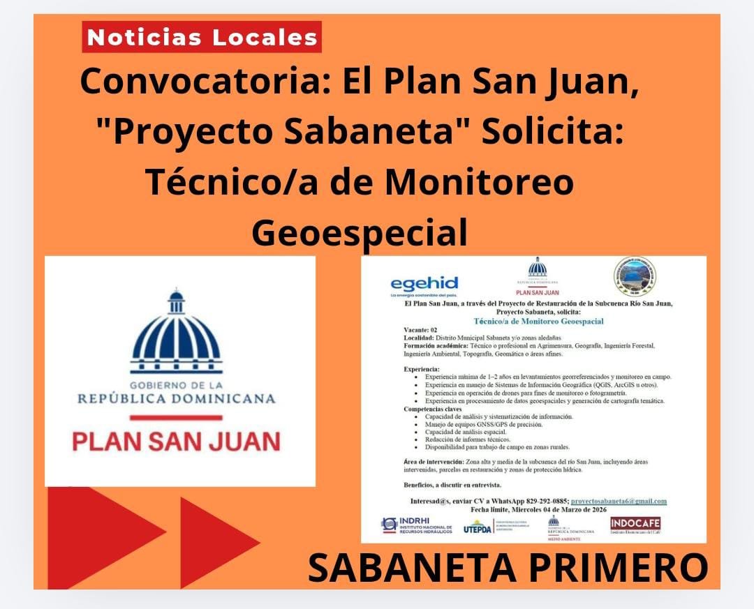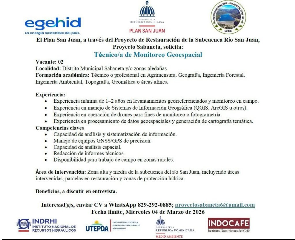 Convocatoria: El Plan San Juan a Través del Proyecto de Restauración de la Sub-Cuenca del Rio San Juan, "Proyecto Sabaneta", Solicita: Técnico/a de Monitoreo Geoespecial