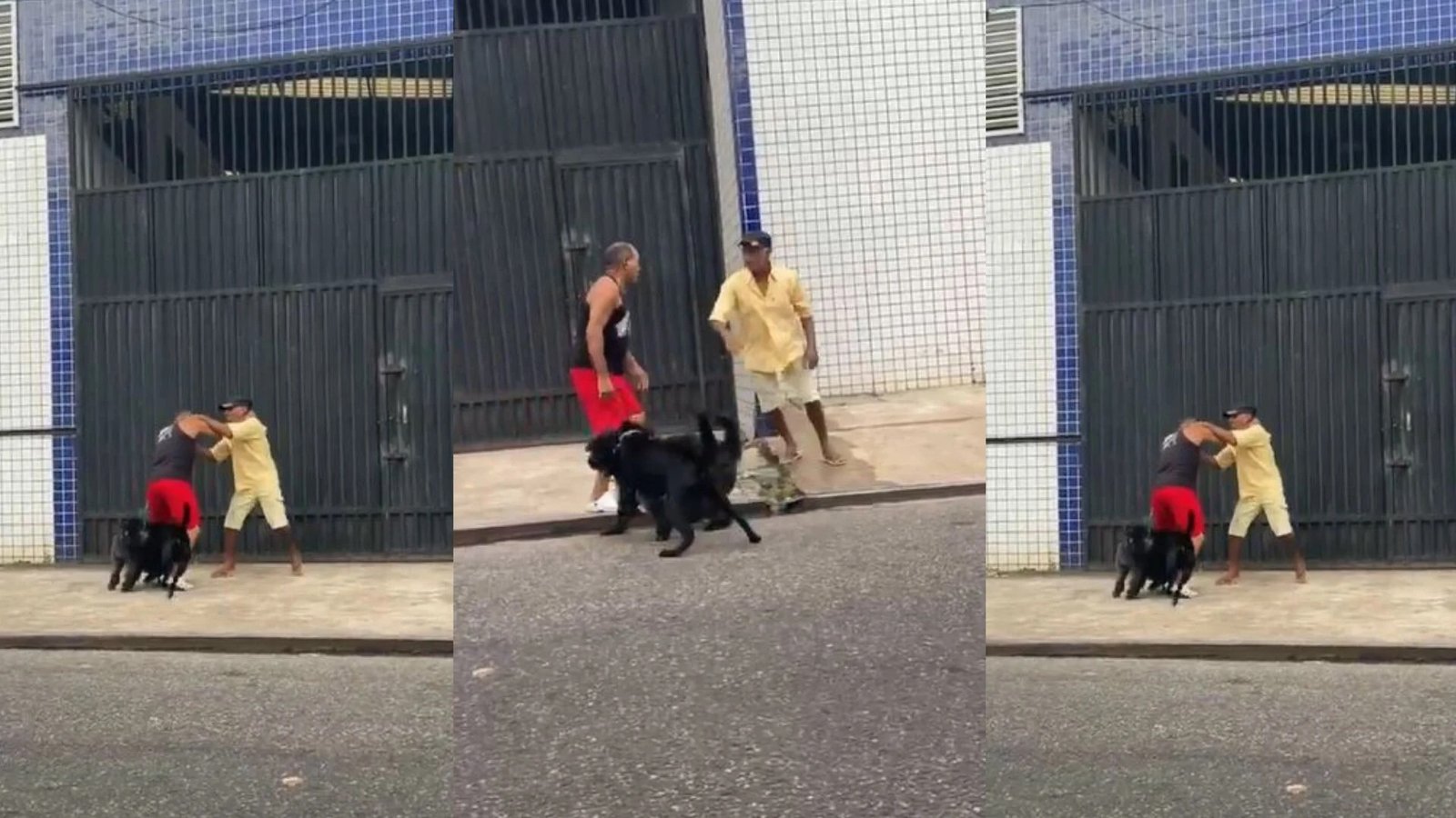 Cuatro perros serían?:  ¡Curiosa pelea! Dos hombres y sus perros se enfrentan en plena calle