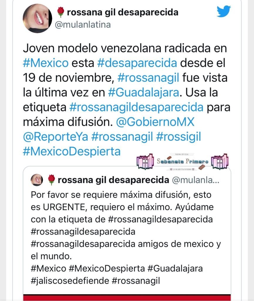 La modelo venezolana Rossanna Gil se encuentra desaparecida y fue vista por última vez en la ciudad de Guadalajara, México. La información se dio a conocer a través de las redes sociales cuando usuarios de Twitter comenzaron este martes a publicar imágenes con el rostro de Gil señalando que desapareció.