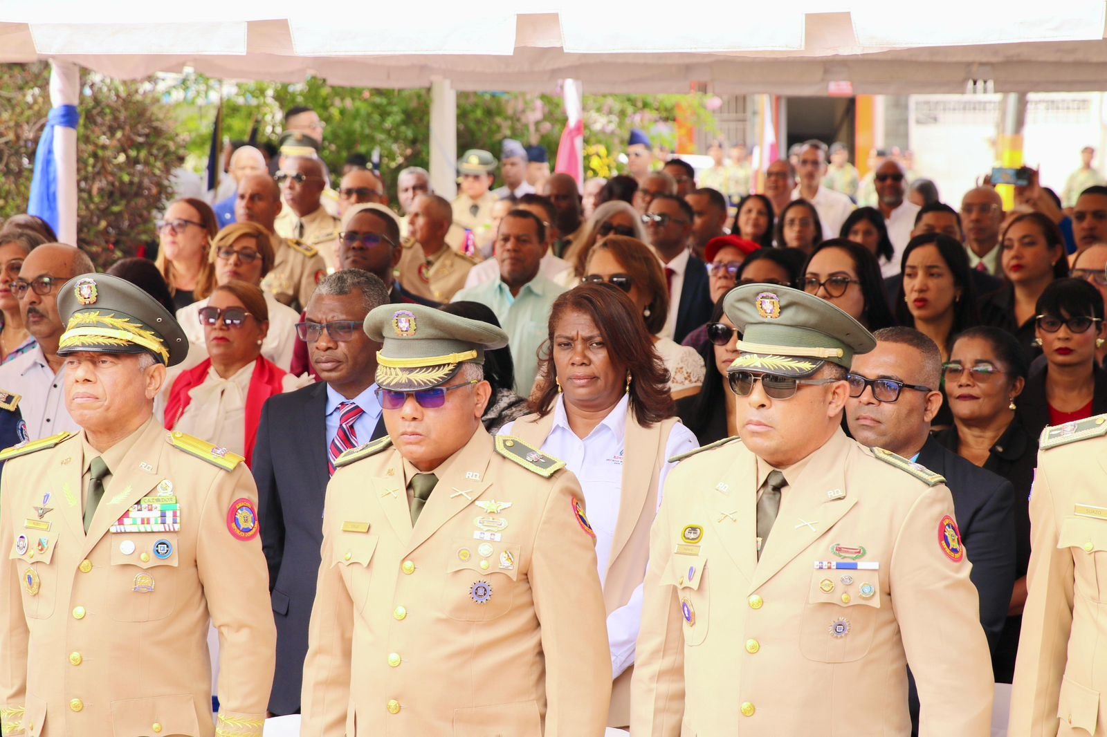 Los honores militares de estilo fueron realizados por los cuerpos castrenses en el parque José María Cabral, donde también se llevó a cabo el toque de ofrenda y el desfile de abanderados, destacándose la participación activa de diversos centros educativos pertenecientes al Distrito Educativo 02-05 San Juan Este.
