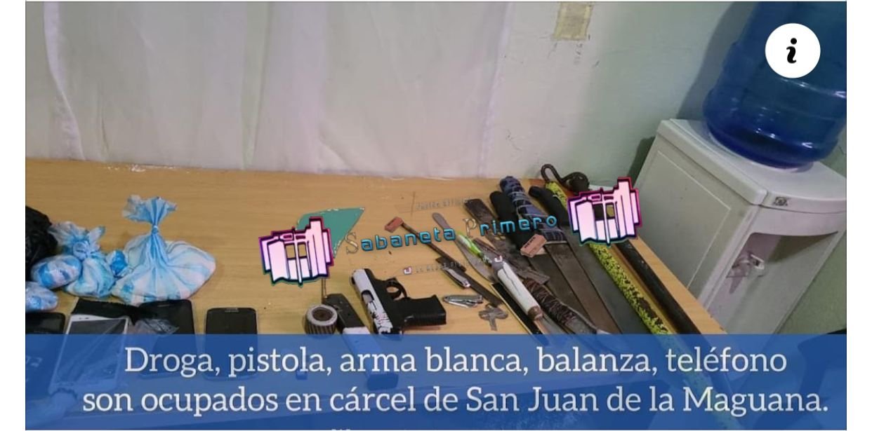 La Dirección General de Servicios Correccionales y Penitenciarios, explicó que la Tercera Brigada de Infantería del ERD, informaron sobre una requisa en la que los privados de libertad entregaron una pistola calibre 9 milímetros, marca Taurus, con un cargador y dos cápsulas, 10 armas blancas, cinco funda con un polvo blanco presumiblemente cocaina, entre otros objetos prohibidos en el penal.