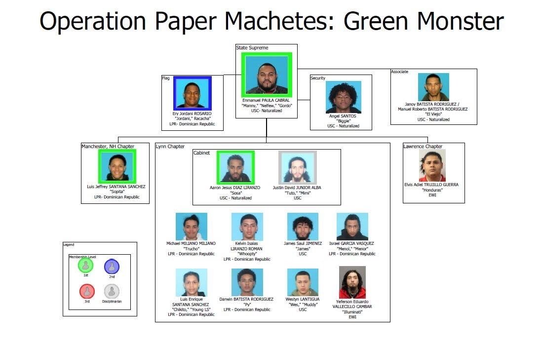 La pandilla Trinitarios tenía un sistema de reclutamiento en escuelas secundarias localesde Lynn y Lawrence, donde se captaba a jóvenes para sumarse a sus filas. Ocho pandilleros han sido detenidos, mientras que otros se encuentran prófugos. Algunos de los miembros arrestados están en Honduras y República Dominicana, a la espera de ser extraditados a Massachusetts.