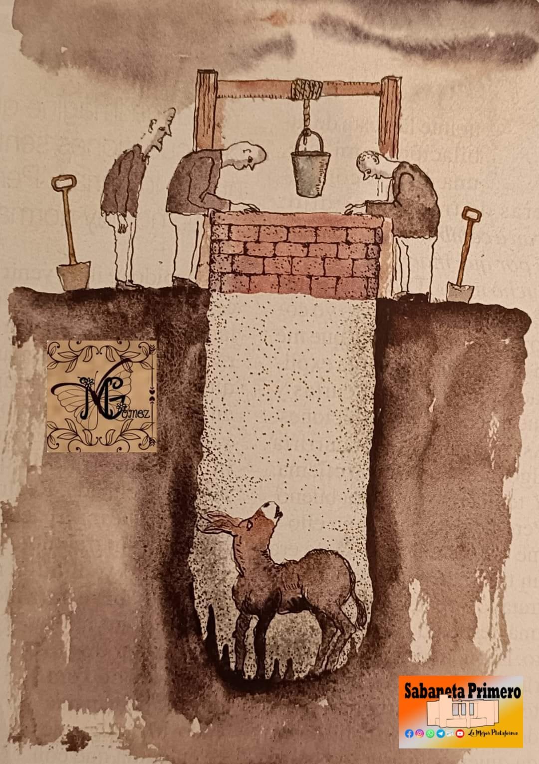 El burro de un campesino se cayó un día en un pozo oculto tras la maleza. El animal se quedó allí durante horas mientras su dueño trataba de encontrar una manera de rescatarlo. Finalmente y tras mucho cavilar, el hombre pensó que el animal estaba ya muy viejo y que, por otro lado, aquel pozo estaba seco, por lo que el esfuerzo que iba a tener que hacer para sacarlo de allí no valía la pena, que lo mejor sería tapar el foso para evitar más accidentes.