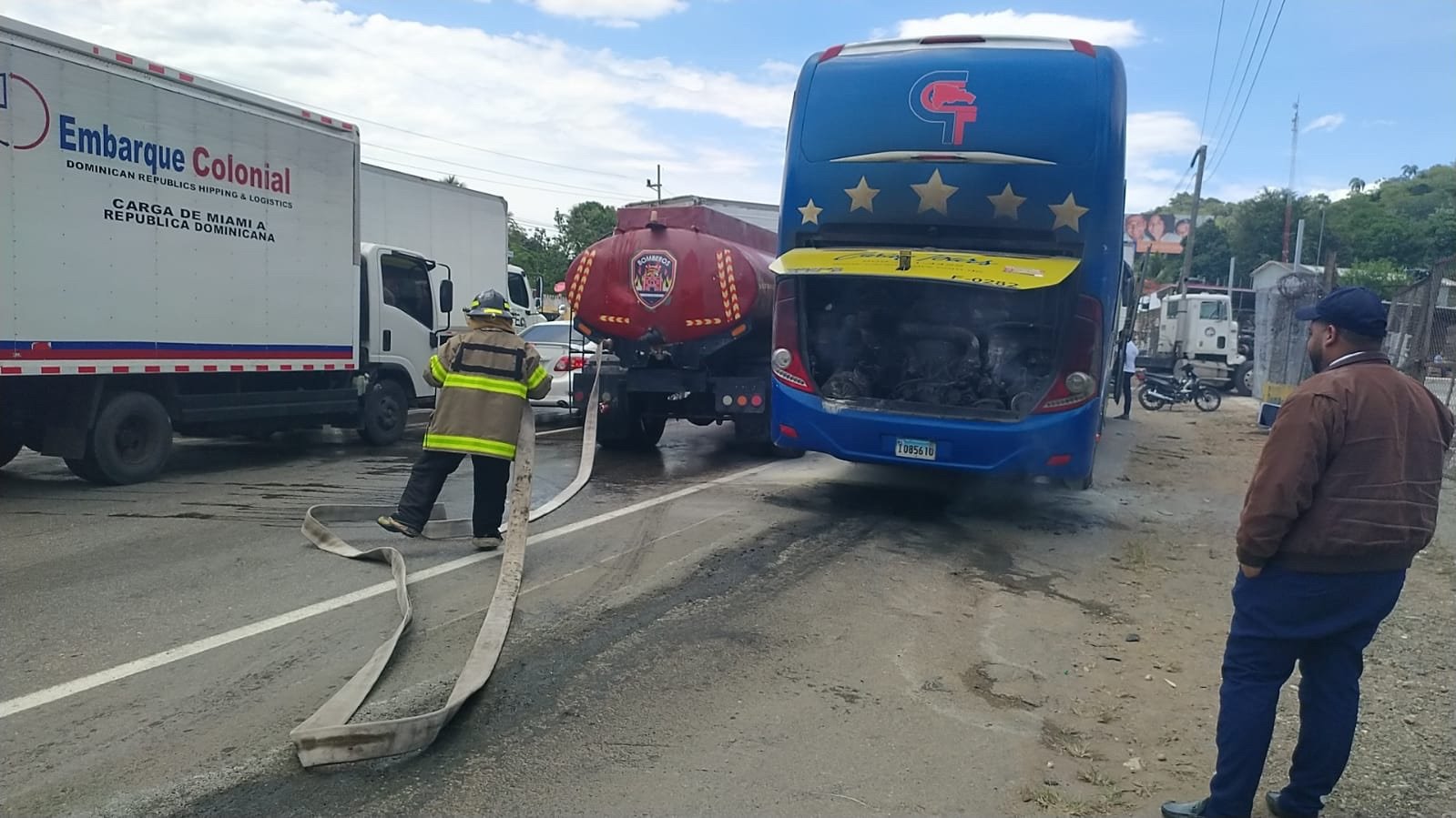 El hecho más impactante fue el incendiodel motor de una guagua de transporte Caribe Tours. Según nuestro corresponsalen la zona, algunos pasajeros, ante la emergencia, tuvieron que salir del vehículo saltando por las ventanillas, mientras los bomberos controlaron las llamas de inmediato, evitando que el fuego se propagara a otros vehículos.