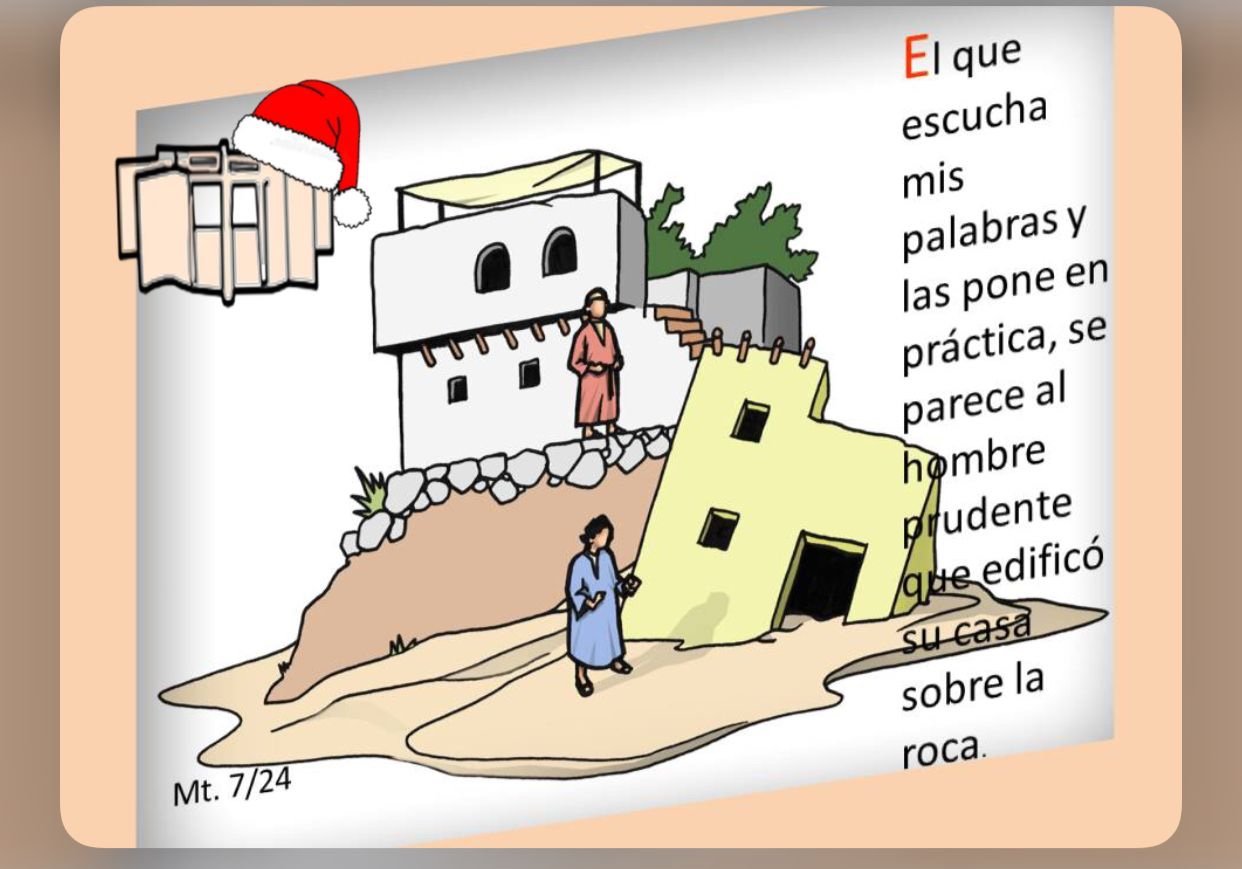 El que escucha estas palabras mías y las pone en práctica, se parece a un hombre prudente que edificó su casa sobre roca. Cayó la lluvia, se salieron los ríos, soplaron los vientos y rompieron contra la casa; pero no se hundió, porque estaba cimentada sobre roca. El que escucha estas palabras mías y no las pone en práctica, se parece a aquel hombre necio que edificó su casa sobre arena. Cayó la lluvia, se salieron los ríos, soplaron los vientos y rompieron contra la casa; y se hundió totalmente».