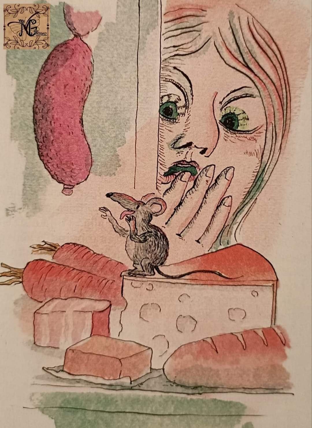 Un ratoncito se coló una noche en una tienda llena de exquisiteces. El pequeño roedor empezó a oler todas las cosas buenas que había a su alrededor: mantequilla, tocino, chocolate… Y, sobre todo, ¡el queso! Se alzó sobre sus patitas traseras y, sin poder reprimirse, emitió un grito de felicidad. Pero, ¿con qué debería empezar su banquete? Iba a hincarle el diente a un trozo de mantequilla cuando le llegó el aroma a un chorizo riquísimo desde el otro lado del local. Cuando iba hacia allá, notó el olor de un exquisito queso francés, que le hizo dar media vuelta. A punto de empezar a devorarlo, le invadieron las fragancias de las zanahorias frescas. El pobre ratón corría de un lado para otro sin saber qué es lo que tenía que comer primero. Y, de repente, se hizo de día, la gente empezó a llegar a la tienda y tuvo que escaparse de allí. De regreso a su casita, el roedor les dijo a sus amigos: «Nunca más volveré a esa tienda. ¡Cuando vas a empezar a comer, te echan fuera!».