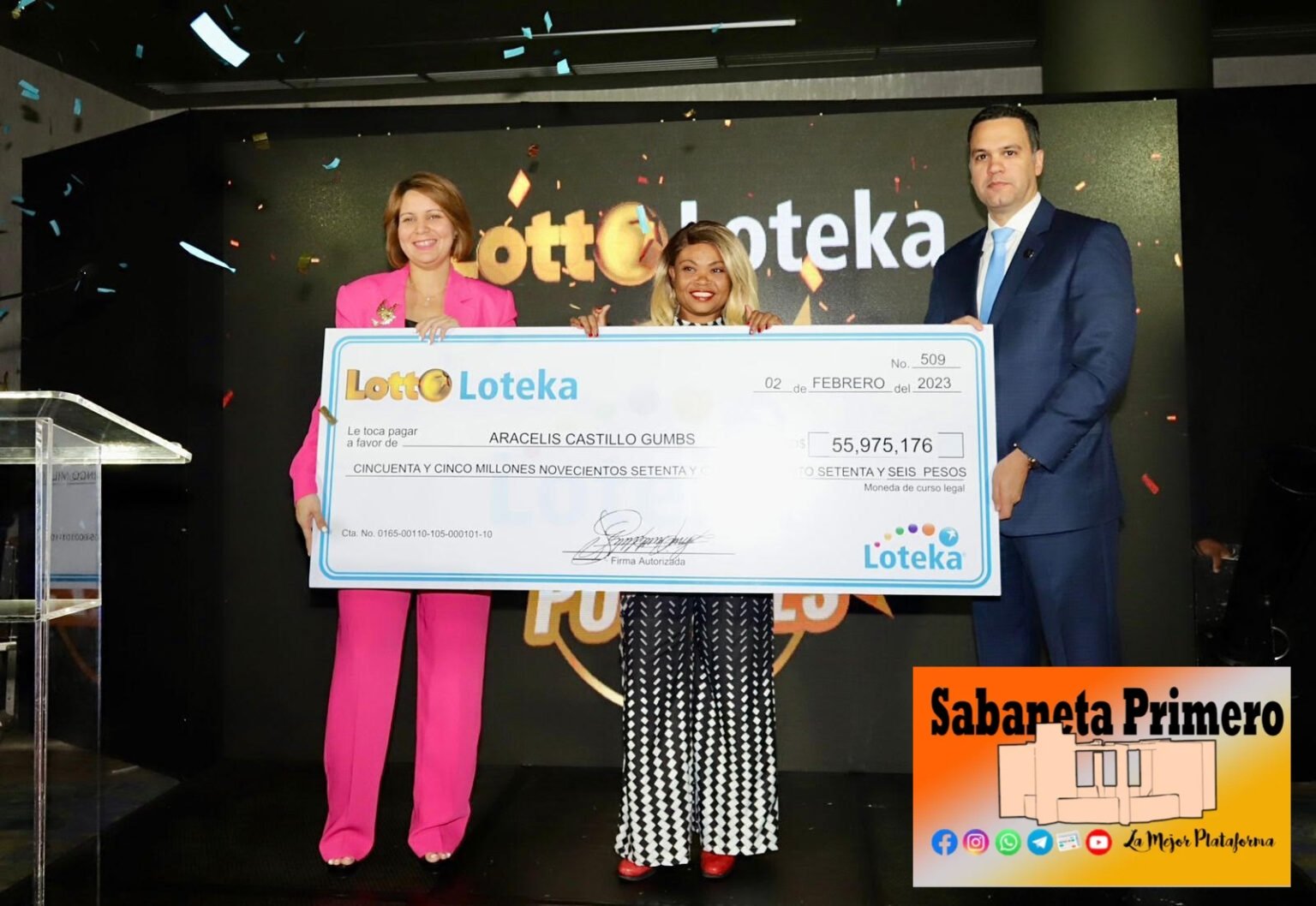 Santo Domingo.- La empleada doméstica, Aracelis Castillo Gumbs, recibió 55.9 millones de pesos que ganó con la Lotto de Loteka.