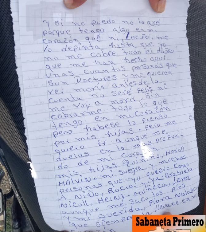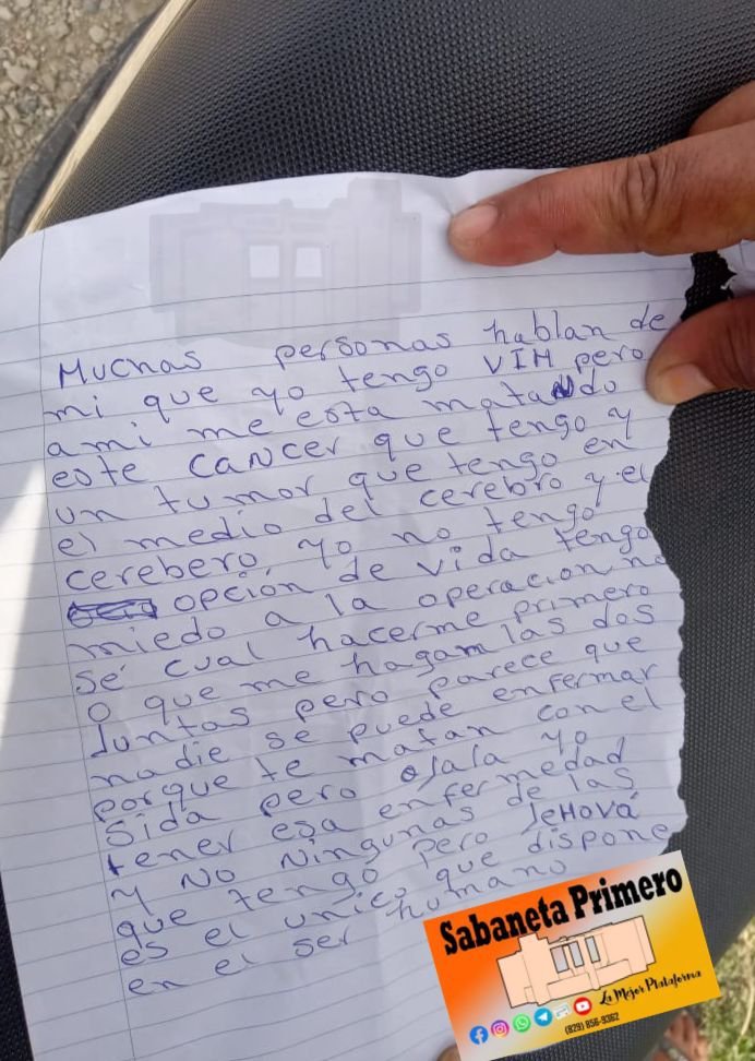El cuerpo sin vida de la joven fue encontrado y al lado una carta manuscrita que decía " Muchas personas hablan de mi, que yo tengo VIH, pero a mí me está matando este cáncer que tengo y un tumor en medio del cerebro; yo no tengo opción de vida, tengo miedo a la operación, no sé cuál hacerme primero o que me hagan las dos juntas, pero parece que nadie se puede enfermar, por qué te matan con el sida, ojalá yo tener esa enfermedad y no ninguna de las dos; pero Jehová es quien dispon en el ser humano", reza parte de la carta.