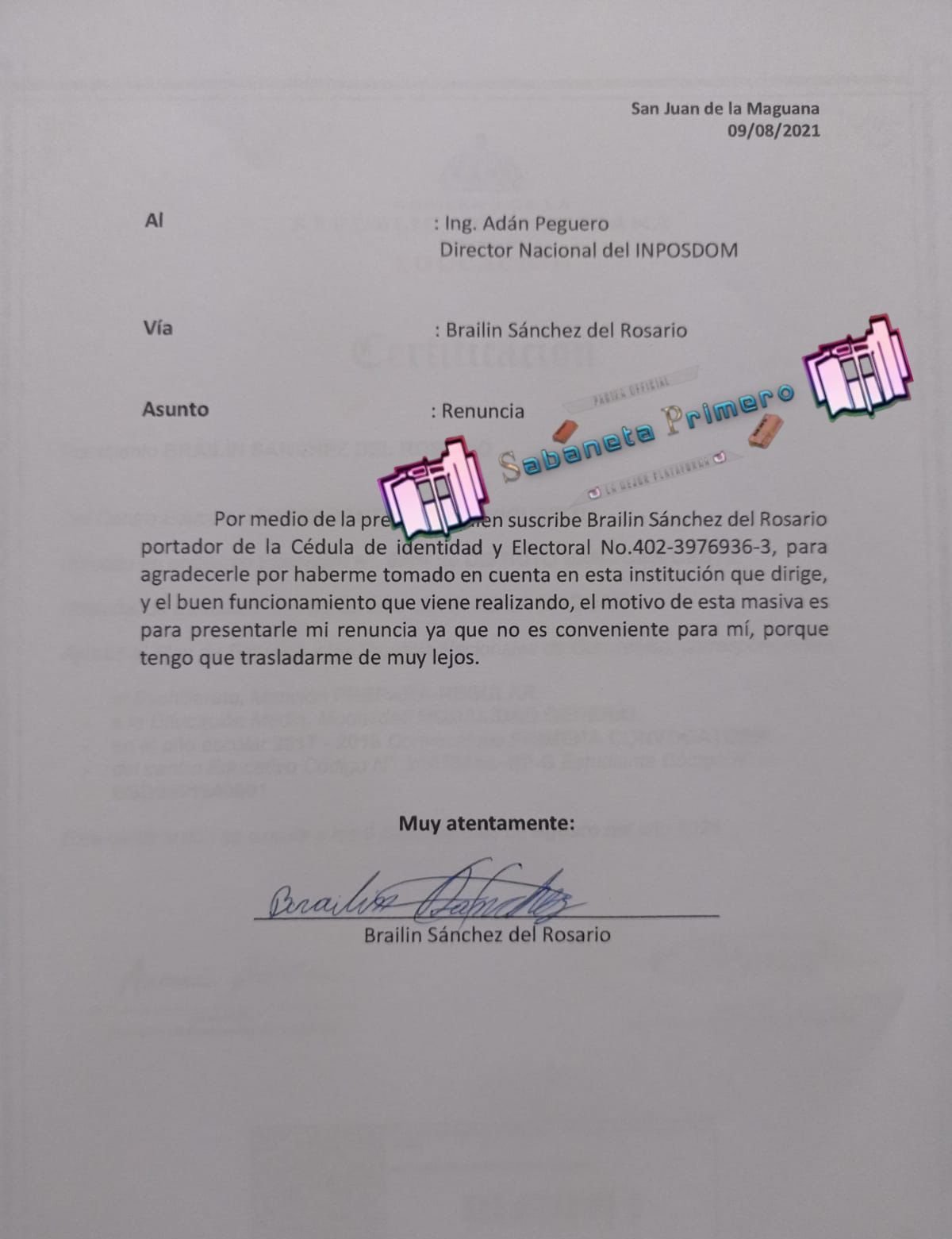 Sabaneta, San Juan de la Maguana, RD- Quien hasta hace hora fuera parte del gobierno del cambio que encabeza el presidente Luis Abinader, en el Instituto Postal Dominicano ( INPOSDOM ), renunció a su cargo.