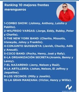 RANKING SABOR A MERENGUE. Ross Peña dirige esa estación virtual consagrada al merengue. Su listado inicia con la agrupación Los Hijos del Rey, creada por Wilfrido Vagas y para el 1976-1978 estuvo un selecto frente integrad por figuras que luego se convirtieron en astros del ritmo, como son: Fernández Villalona, Los hermanos Kenton (Tito y Luis) y Raulín Rosendo.