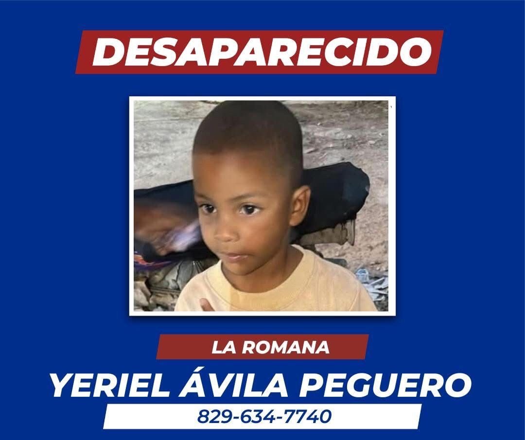 Reportan desaparecido el niño Yeriel Severino Ávila Peguero, hijo de la señora Yulaine Peguero. El menor fue visto por última vez este viernes, a la 1:00 de la tarde, en el sector Pica Piedra, del municipio Villa Hermosa, provincia La Romana.