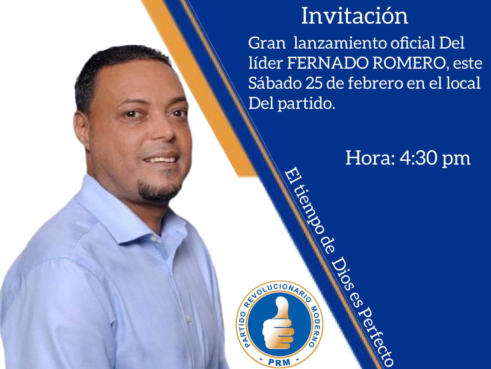 Fernando Romero y su equipo, están invitando al pueblo en general, en especial a los del partido de gobierno a ser parte del lanzamiento oficial como aspirante a dirigir los destinos del ayuntamiento de Sabaneta a partir del año 2024.