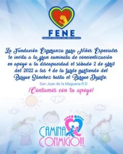San Juan-RD. Con el objetivo de sensibilizar y concientizar a la sociedad sobre salvaguardar los derechos e inclusión de los niños con discapacidades, la Fundación Esperanza para niños Especiales -FENE-, convoca para esté próximo 2 de abril sumarse a la marcha "Camina Conmigo", en conmemoración al Día Internacional