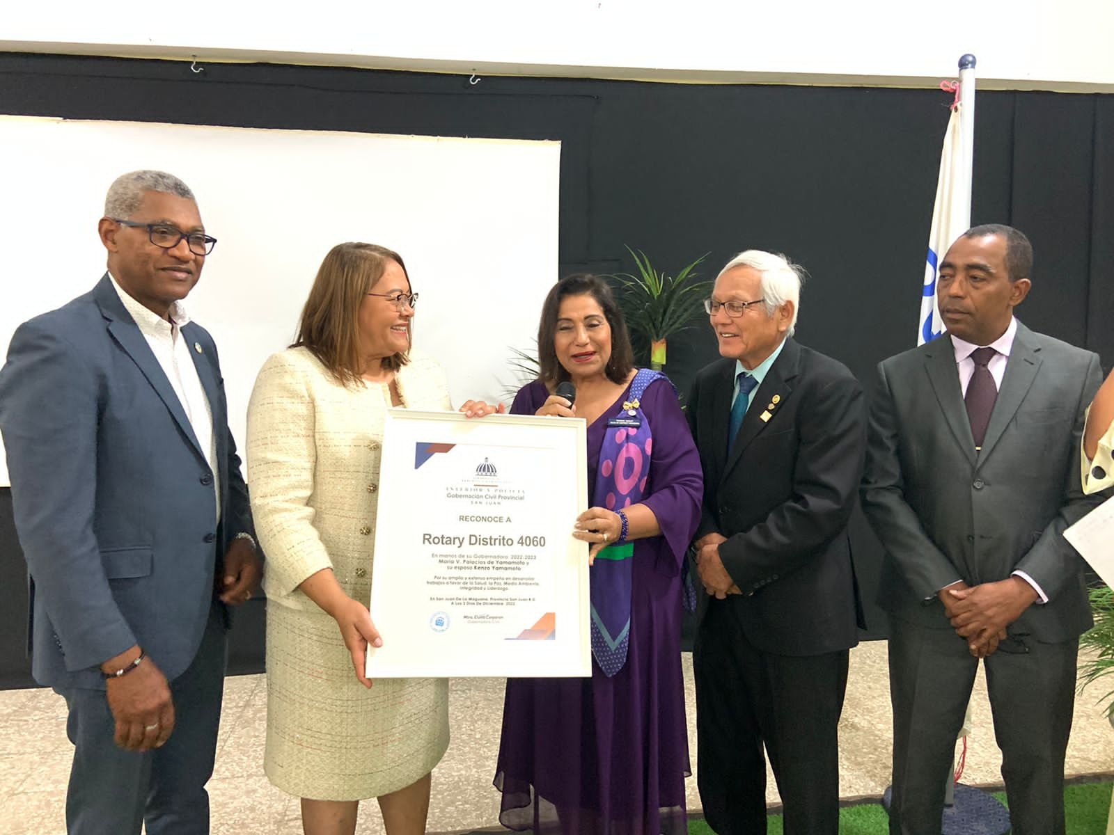 San Juan De La Maguana, en ocasión de la visita oficial a la provincia San Juan, de la gobernadora del distrito Rotario 4060 María V. Palacios de Yamamoto, la gobernación provincial entrego un reconocimiento al distrito Rotario 4060.