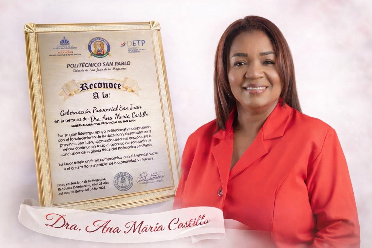 En representación de la Gobernadora Provincial, estuvo presente el Dr. Robert Payano Alcántara, quien recibió el reconocimiento otorgado a la Dra. Ana María Castillo Mateo, distinción que resalta su firme compromiso con el desarrollo educativo y su apoyo constante a la culminación del Politécnico San Pablo.
