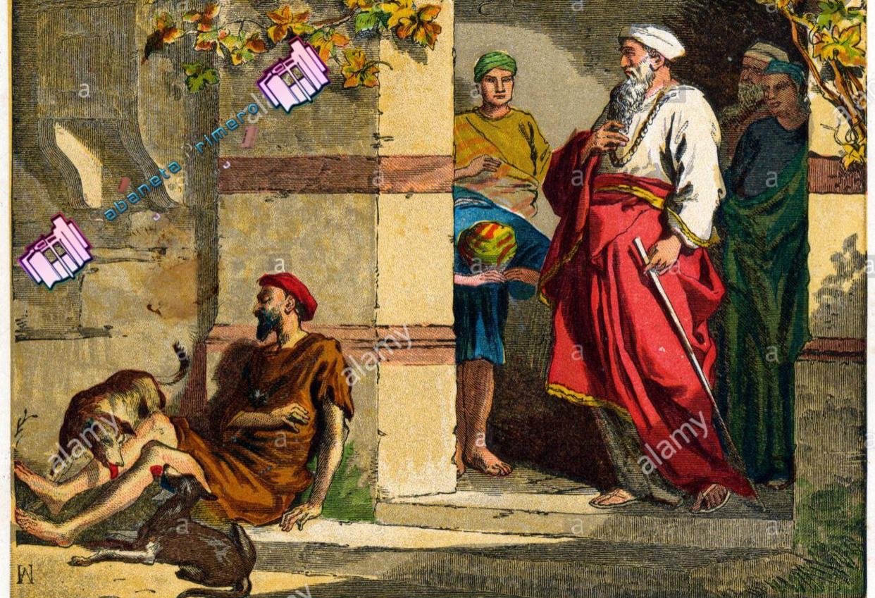En aquel tiempo, dijo Jesús a los fariseos: «Había un hombre rico que se vestía de púrpura y de lino y banqueteaba cada día. Y un mendigo llamado Lázaro estaba echado en su portal, cubierto de llagas, y con ganas de saciarse de lo que caía de la mesa del rico. Y hasta los perros venían y le lamían las llagas.