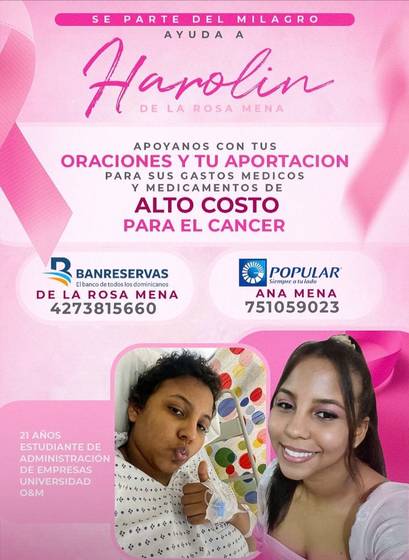 Sabaneta, San Juan — Con un llamado urgente a la solidaridad, familiares y amigos solicitan el apoyo de toda la comunidad para Hamolin de la Rosa Mena, una joven de 21 años que enfrenta una dura batalla contra el cáncer y necesita cubrir gastos médicos y medicamentos de alto costo.