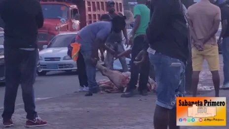 SANTO DOMINGO.- El cuerpo de un animal inerte en la acera y varias personas a su alrededor haciéndolo pedazos para repartirlo entre el grupo, fue la escena captada en la avenida Jacobo Majluta, Santo Domingo Norte, por un ciudadano que pasaba por el lugar.