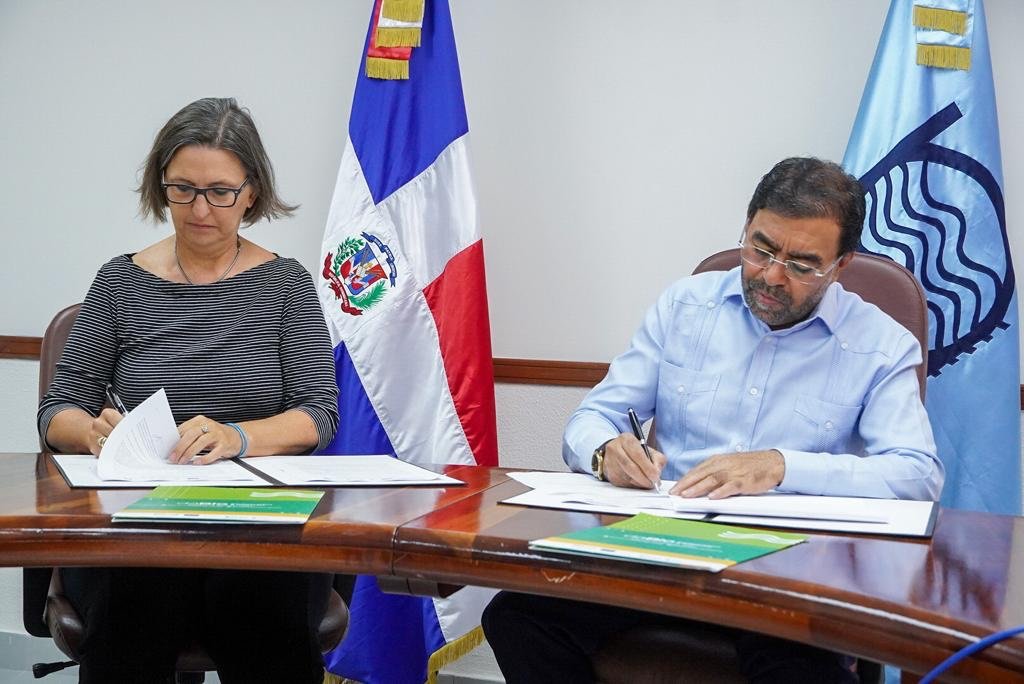 SANTO DOMINGO.- Olmedo Caba Romano, director ejecutivo del Instituto Nacional de Recursos Hidráulicos (INDRHI), y Svenja Paulino, directora regional del Programa de Biodiversidad y Negocios en América Latina de la Cooperación Alemana para el Desarrollo, (GIZ), firmaron el convenio donde el organismo hídrico se compromete a facilitar la asesoría y apoyo técnico, previamente acordado de forma verbal entre las partes, en el desarrollo de un modelo hidrológico en la cuenca del río Yeguada de la provincia El Seibo, con miras a establecer un sistema de alerta temprana con base científica en el marco del proyecto “El Seibo Resiliente”.