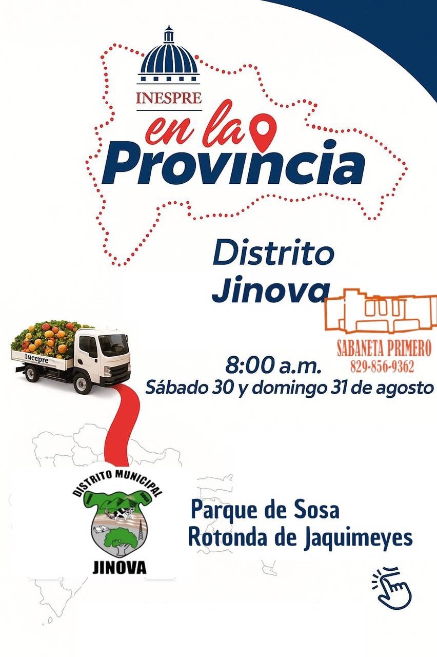 San Juan de la Maguana, RD- El Instituto de Estabilización de Precios (Inespre) anunció que este sábado 30 y domingo 31 de agosto el “INESPRE en la Provincia”, estará ofreciendo sus servicios en el distrito municipal de Jinova.