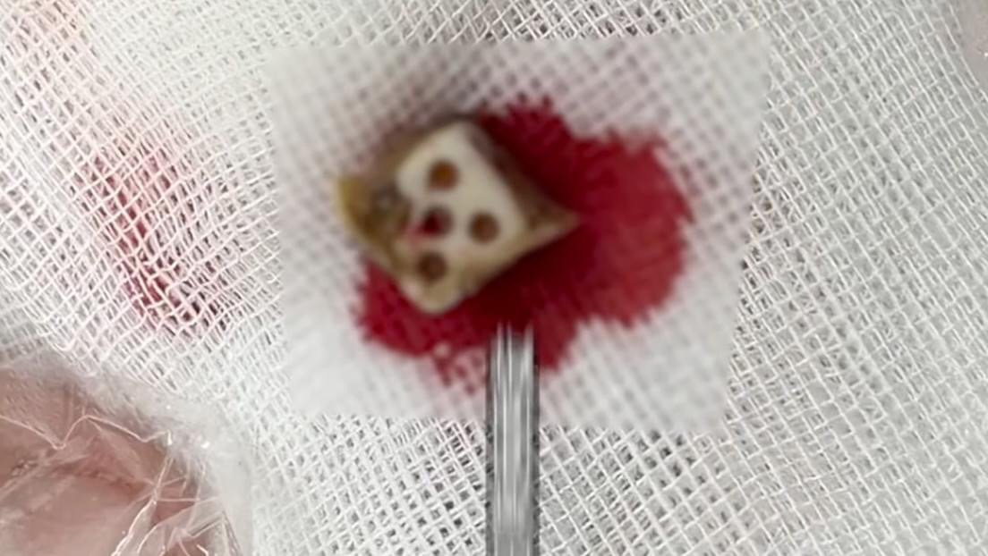 «Durante la endoscopia nasal, descubrimos un objeto extraño: un bulto blanco cubierto de secreciones. Al extraerlo, resultó ser un dado de dos centímetros, parcialmente corroído por haber estado alojado en la cavidad nasal durante un período prolongado. Estaba ubicado en el conducto nasal inferior, lo que causaba daños en la mucosa nasal», explicó Yang Rong, otorrinolaringólogo de un hospital de Xian.