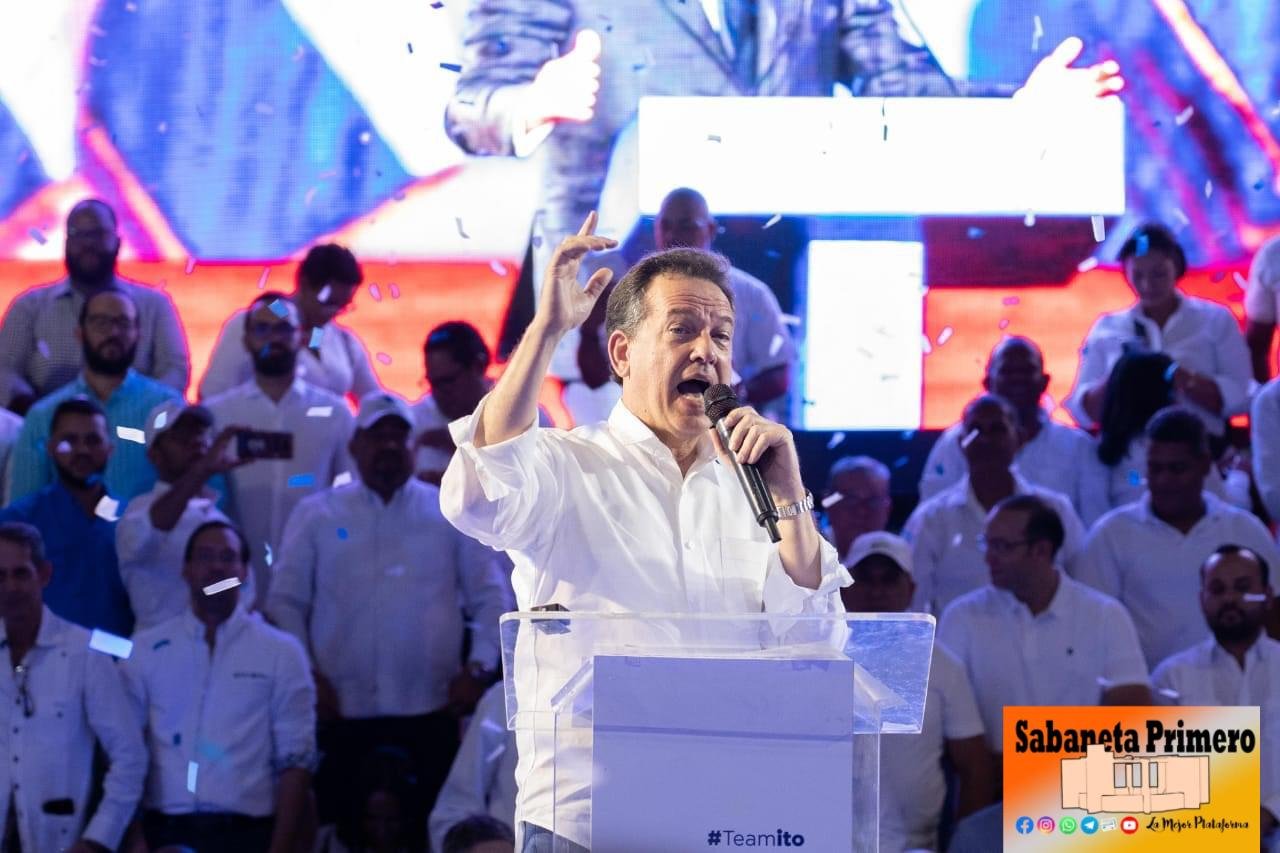 “Este equipo ha dado sólida muestra de que no se acomoda, ni descansa y que trabaja en procura de materializar lo que se está oyendo con fe e insistencia de la mayoría de los dominicanos, que desde ya repiten en las calles y en cada rincón del país que Abinader vuelve y vuelve, con la consigna de 4 años más”, expresó ante la multitud.