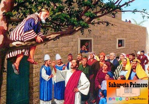 En aquel tiempo, entró Jesús en Jericó y atravesaba la ciudad. Un hombre llamado Zaqueo, jefe de publicanos y rico, trataba de distinguir quién era Jesús, pero la gente se lo impedía, porque era bajo de estatura. Corrió más adelante y se subió a una higuera, para verlo, porque tenía que pasar por allí. Jesús, al llegar a aquel sitio, levantó los ojos y dijo: —«Zaqueo, baja en seguida, porque hoy tengo que alojarme en tu casa.»