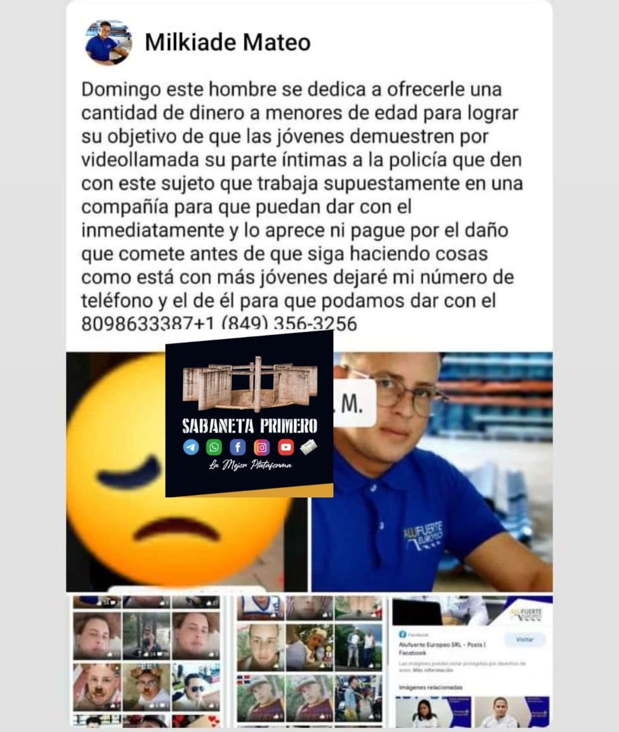 Milkiade Mateo, hijo de uno de los connotados dirigentes del partido de gobierno en la tierra santa, cómo es llamada por muchos a Sabaneta, ha realizado una denuncia de manera pública, donde dice que una persona desconocida a expresado por varias vías divulgar contenidos donde esté supuestamente invita a menores de edad a enviarle fotos y videos de sus partes íntimas.