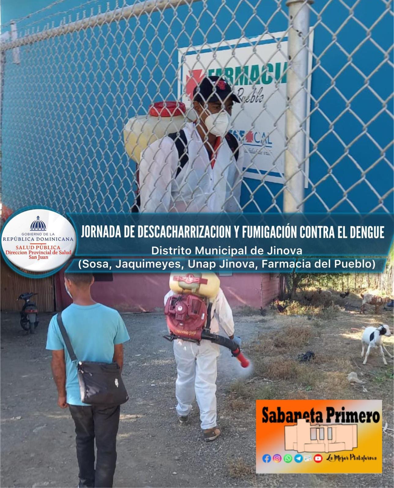 San Juan de la Maguana, RD- Por disposición del Director Provincial De Salud, Dr. Ángel Mateo de la Rosa, se realizó Una Jornadas de Movilización Social Contra el Dengue en el Distrito Municipal de Jinova, y sus secciones Jaquimeyes, Sosa, la Unap Jinova y la Farmacia del Pueblo, a través del equipo de repuesta rápida del Departamento de Salud del Ambiente, como parte de las medidas dispuestas por nuestro ministro.