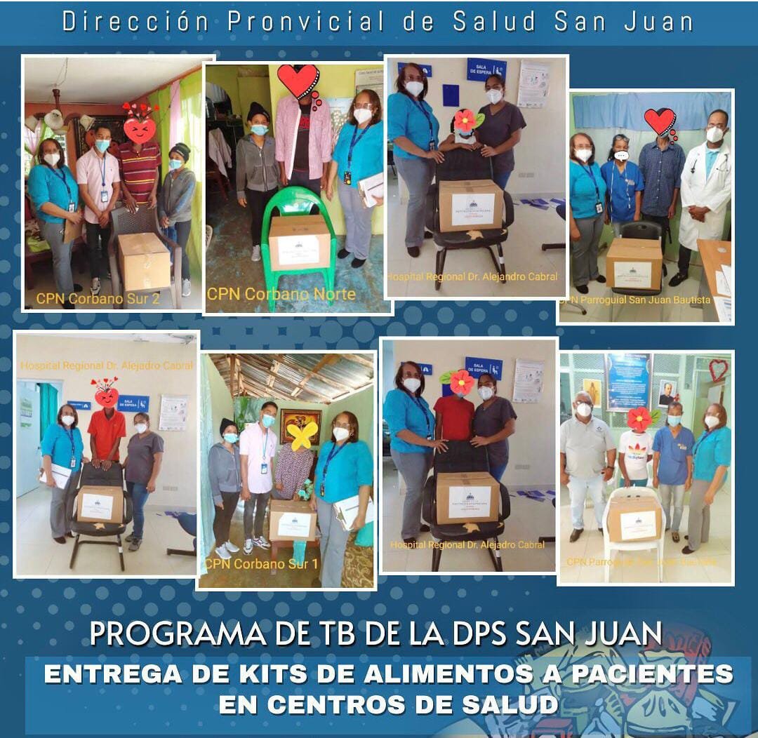 La Dirección Provincial de Salud San Juan realizó la entrega de Kits de Alimentos a pacientes del Programa TB a través de la encargada Lic. Jenny Bocio, abarcando: el Hospital Regional Universitario Alejandro Cabral, CPN Centro Parroquial San Juan Bautista, Corbano Sur, CPN Corbano Norte y CPN Villa Liberación.