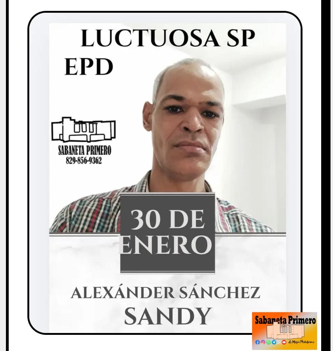San Juan de la Maguana, RD- La Familia Sánchez-Santos en la comunidad de Los Arroyos del Distrito Municipal de Sabaneta, invitan por este medio a los amigos, familiares y allegados a participar en la misa que se realizará en memoria de SANDY, quien falleció tras batallar con una terrible enfermedad.