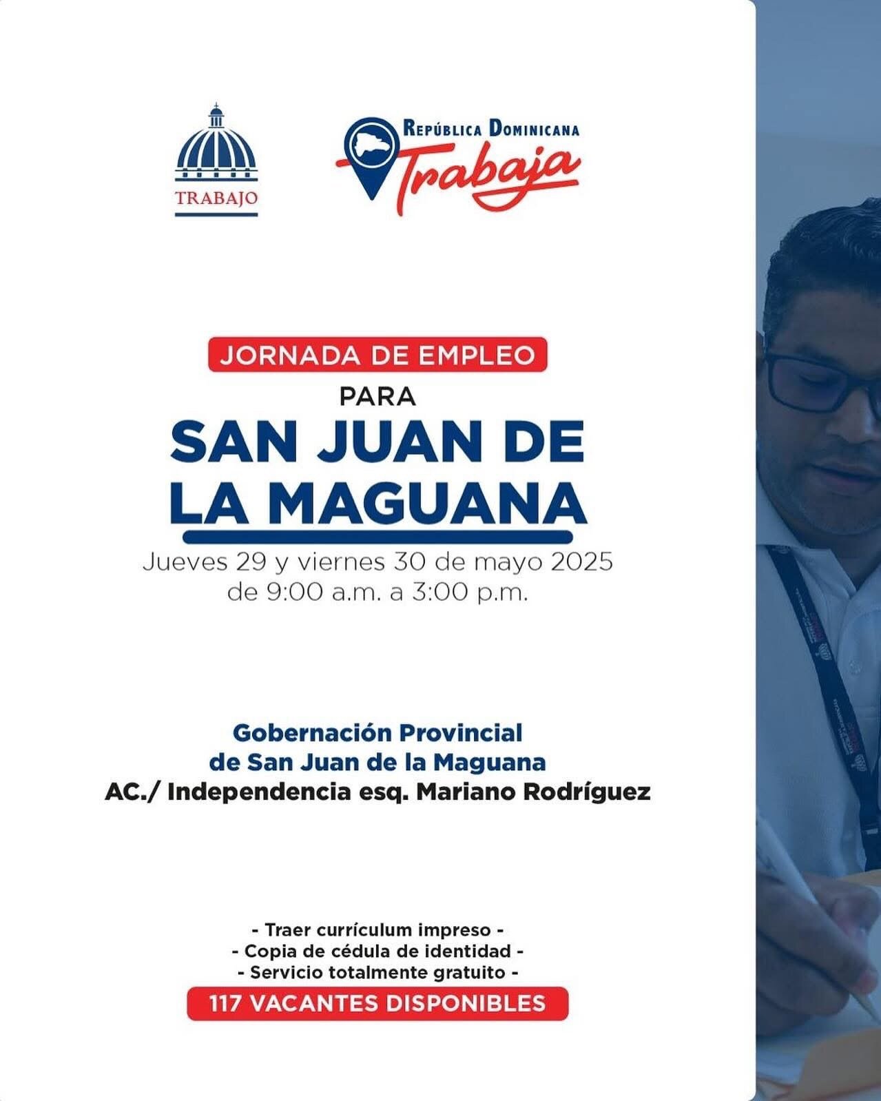 San Juan de la Maguana, RD- La gobernación civil provincial de San Juan que dirige la Dra. Ana María Castillo y el Ministerio de Trabajo están invitando a las personas interesadas a participar en la jornada de empleo para San Juan, este jueves 29 y viernes 30 de mayo de 2025, desde las 9 de la mañana hasta las 2 de la tarde.