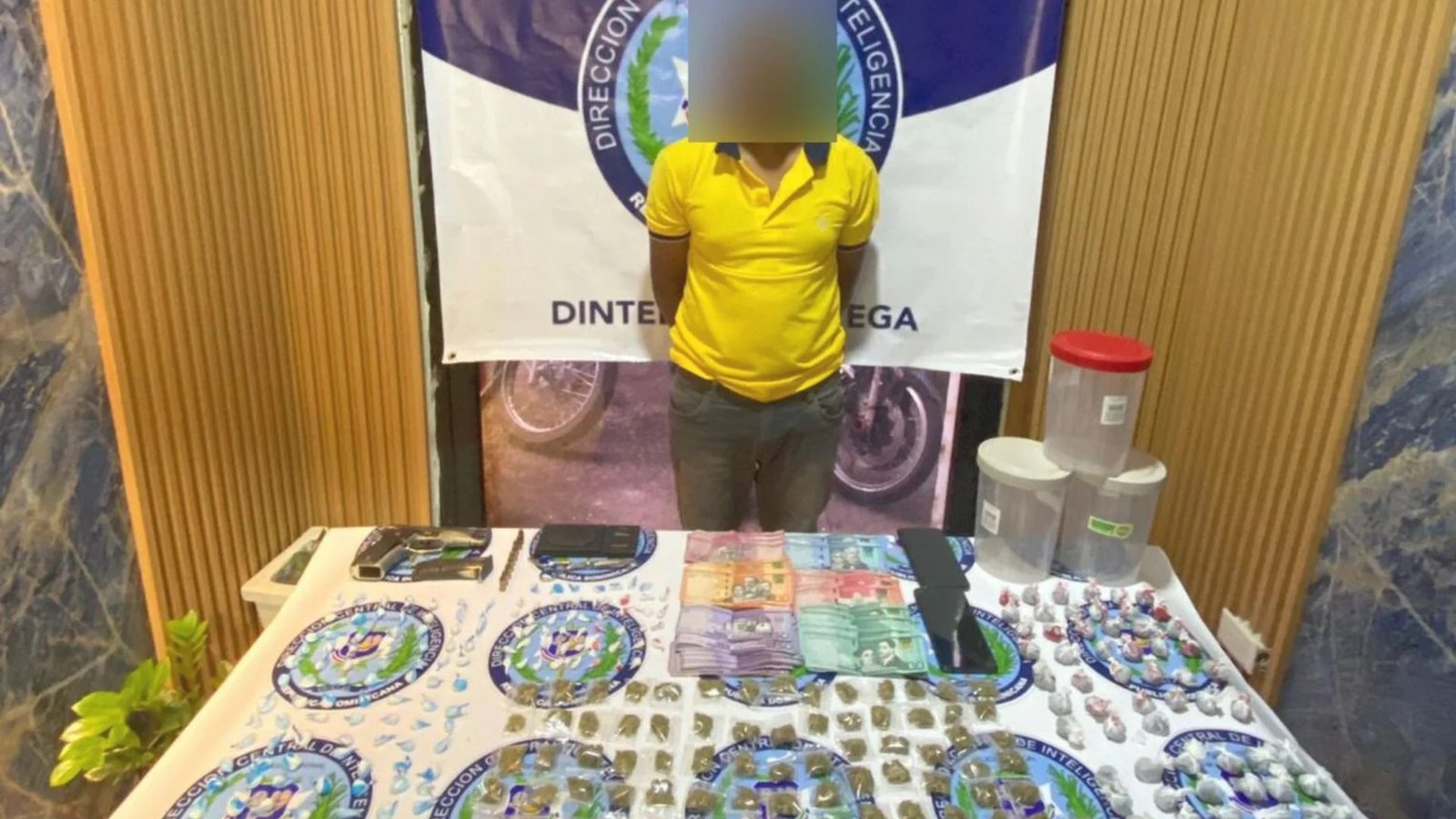 Durante el allanamiento fueron ocupadas 171 porciones de un vegetal que se presume es marihuana, 119 porciones de un polvo blanco presumiblemente cocaína, y 51 porciones de un material rocoso, aparentemente crack, todas distribuidas en fundas de distintos colores.