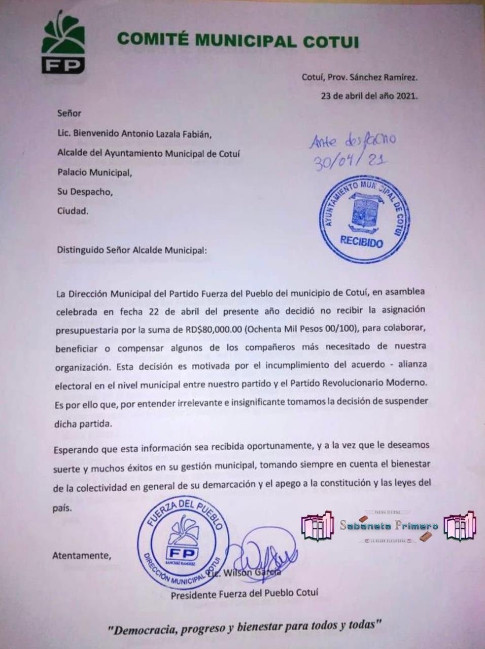 El presidente de la Fuerza del Pueblo, Wilson García, en una carta dirigida al alcalde del PRM en Cotuí, Bienvenido Antonio Lazala (Ñeñé), le devuelve RD$80 mil pesos para colaborar o beneficiar a los miembros de la organización política que dirige Leonel Fernández.