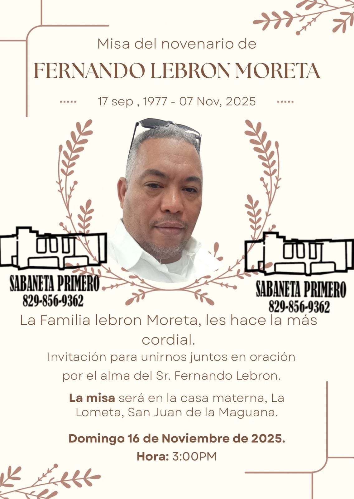 San Juan de la Maguana, RD- La familia Lebrón-Moreta, padres, hijos, hermanos, primos, sobrinos, y demás familiares hacen de conocimiento público de los últimos rezos de Fernando Lebrón ( Dady ).