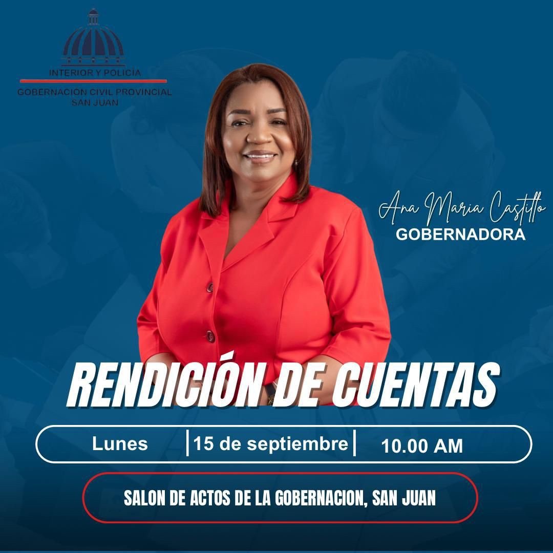 La Gobernación Civil Provincial de San Juan, bajo la dirección de la señora Ana María Castillo, Gobernadora Provincial, tiene el honor de invitarle al acto de Rendición de Cuentas, en el que se presentarán los principales logros, avances y compromisos de gestión en beneficio de nuestra provincia.