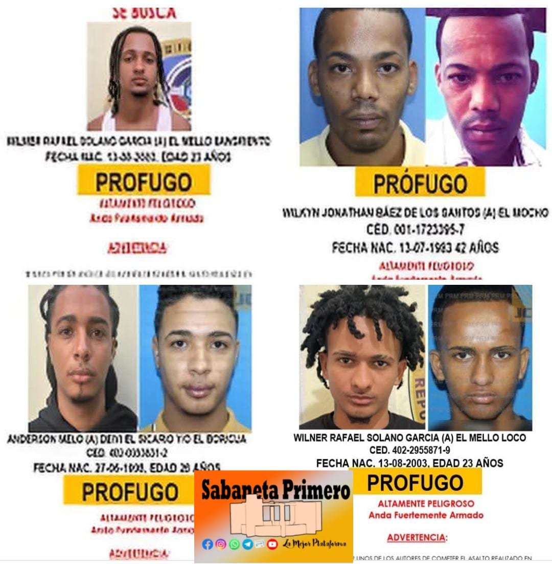 Entre los prófugos buscados figuran Wilmer Rafael Solano García, alias “El Mello Sangriento”; Wilner Rafael Solano García, alias “El Mello Loco”; Anderson Melo, conocido como “Deivi el Sicario” y/o “El Boricua”; y Wilkyn Jonathan Báez de los Santos, apodado “El Mocho”.