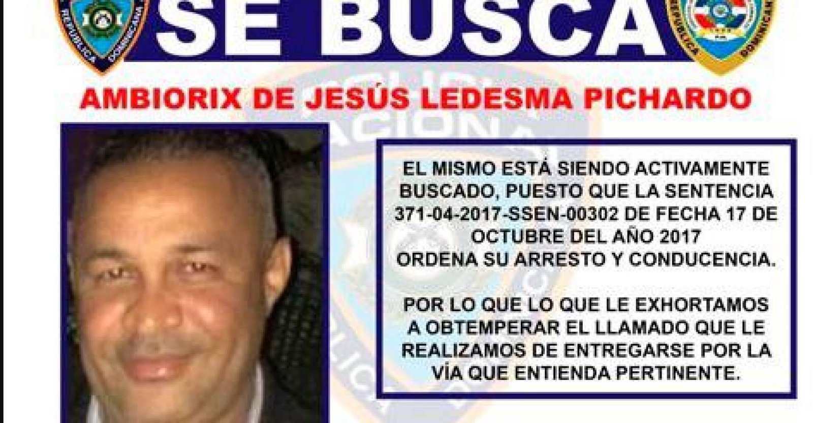 La Policía Nacional exhortó al exregidor Ambiórix de Jesús Ledesma Pichardo que se entregue por la vía que considere pertinente.
