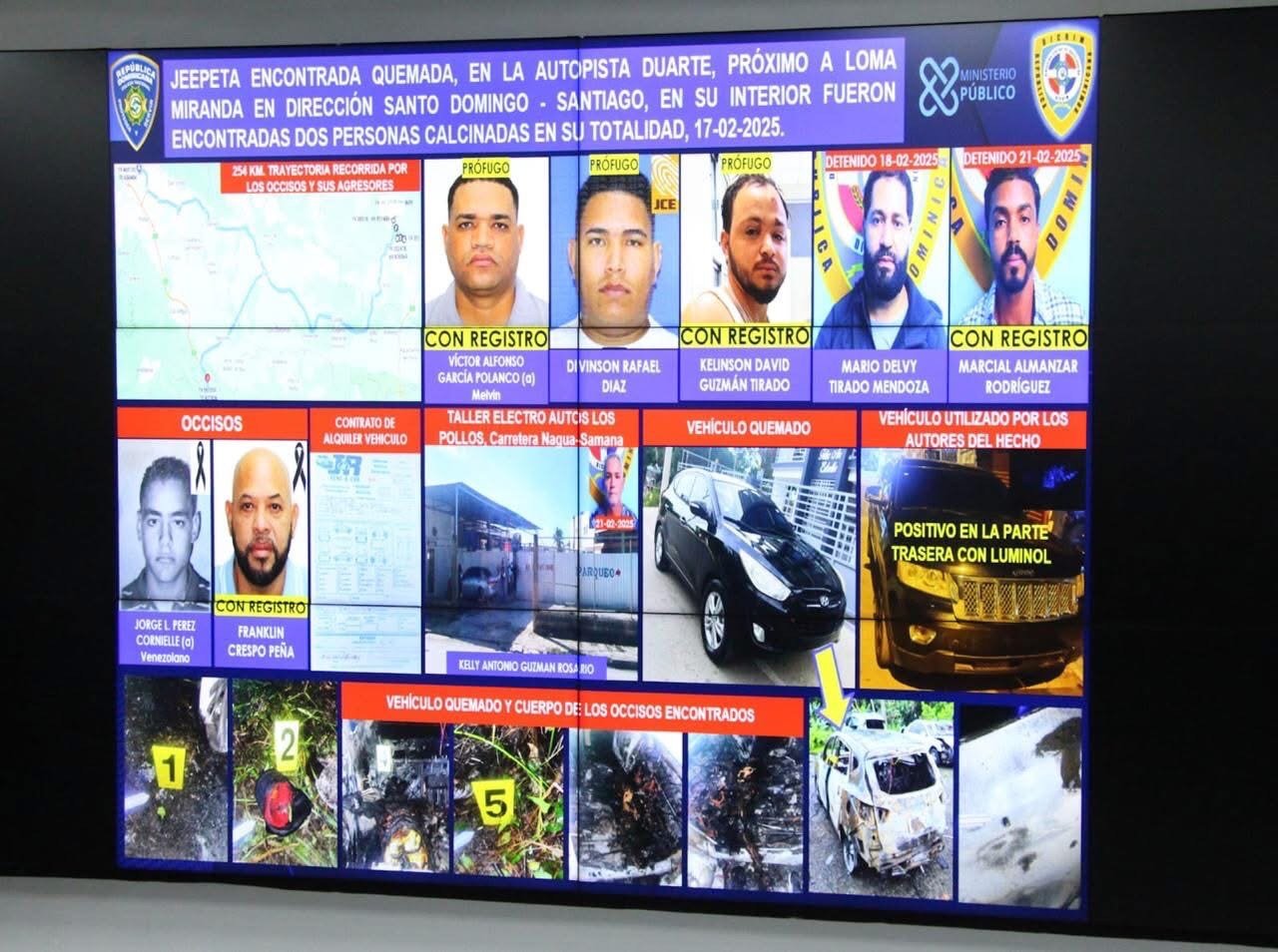 Las víctimas, Franklin Crespo Peña (a) El Viejo, de 56 años, y Jorge Luis Pérez Cornielle (a) venezolano, de 33 años, fueron encontradas calcinadas dentro de una jeepeta en la autopista Duarte, cerca de Loma Miranda. Según las investigaciones, las víctimas habían estado en contacto con los detenidos antes de su asesinato.