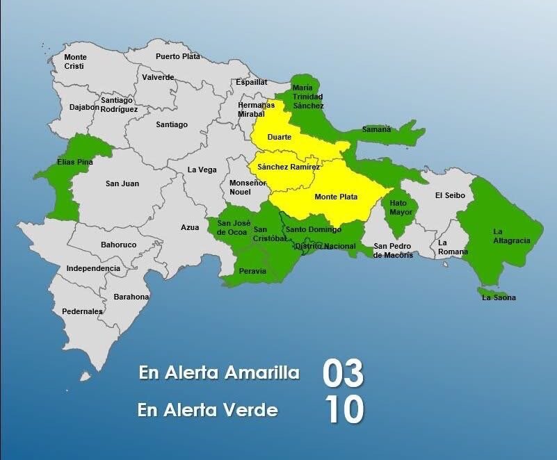 Entre las provincias en alerta 10 están en alerta verde: Santo Domingo San José de Ocoa San Cristóbal María Trinidad Sánchez, Elías Piña Samaná Peravia La Altagracia Distrito Nacional Hato Mayor.